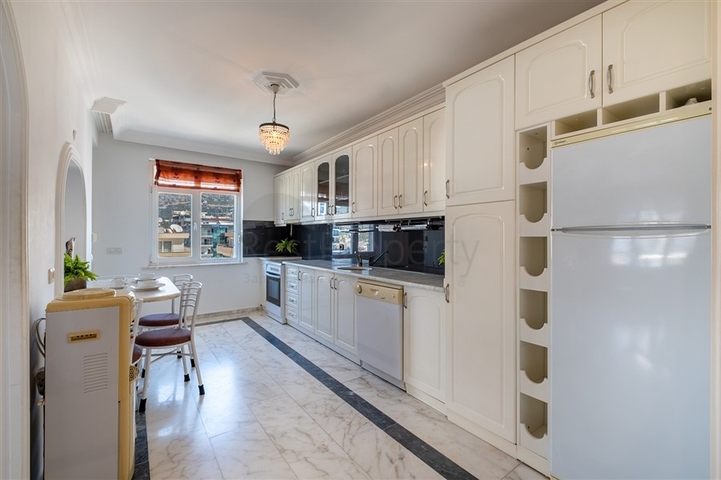 This furnished 2+1 apartment with a total area of 135 m² is located on the 8th floor of a residential building in Mahmutlar, one of the most developed districts of Alanya. The layout includes a bright living room, a separate kitchen area, two bedrooms, one bathroom, two WCs, and a balcony.